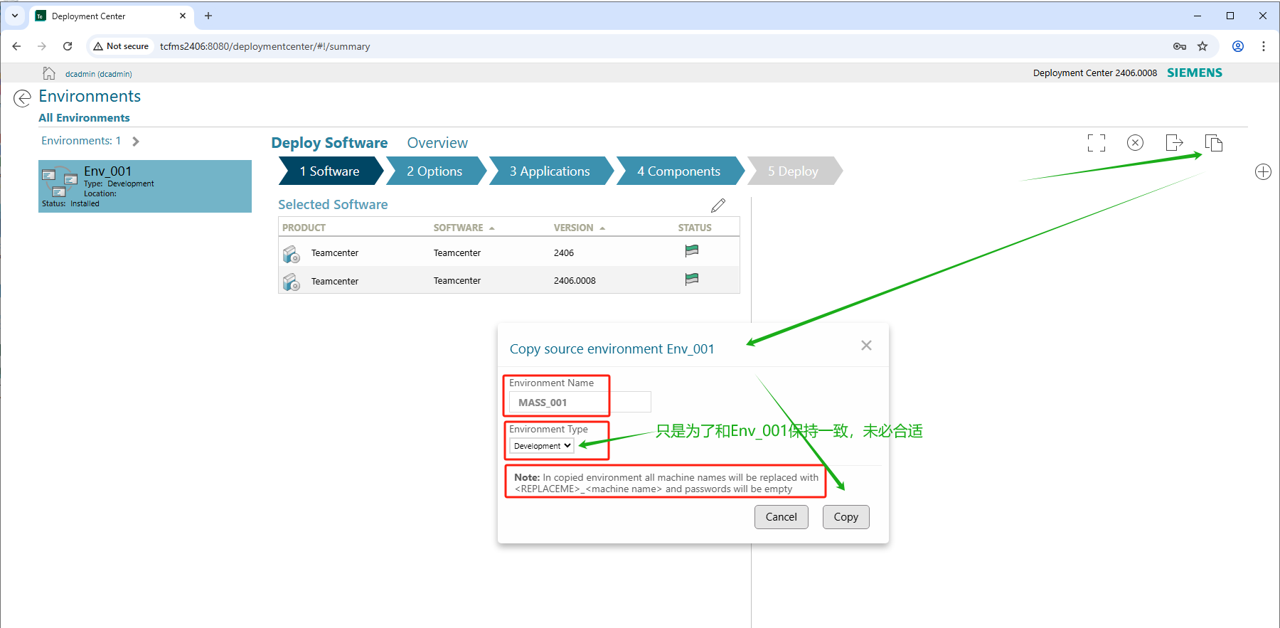 1. 点击DC web页右上角的“Copy Environment”,复制为MASS_001。此时MASS_001中机器名默认都加上了REPLACEME_的前缀,密码都被清空。