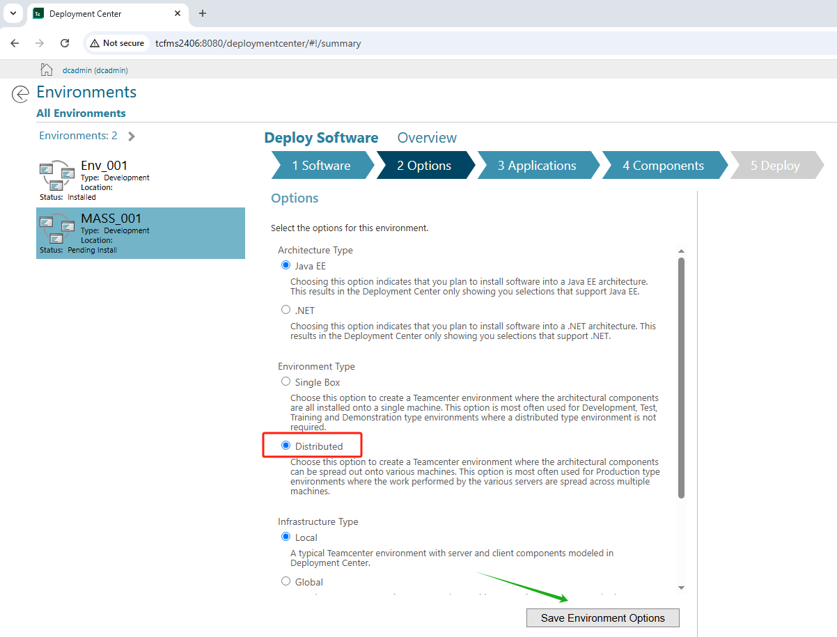 2.修改Options,在Options页面上,将Environment Type改为“Distributed”。Infrastructure Type作用未知,所以没动。点击“Save Environment Options”保存修改。