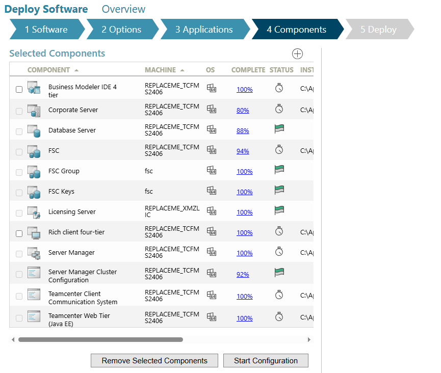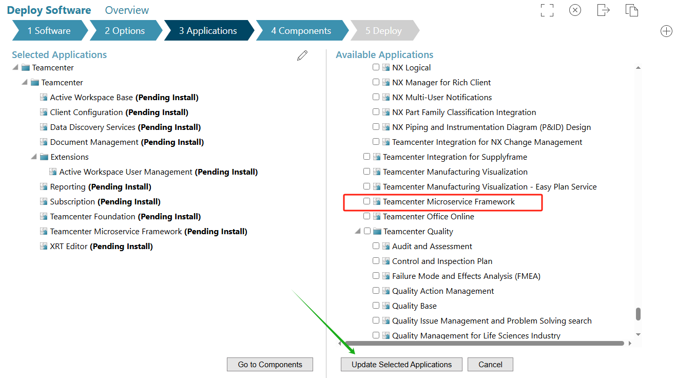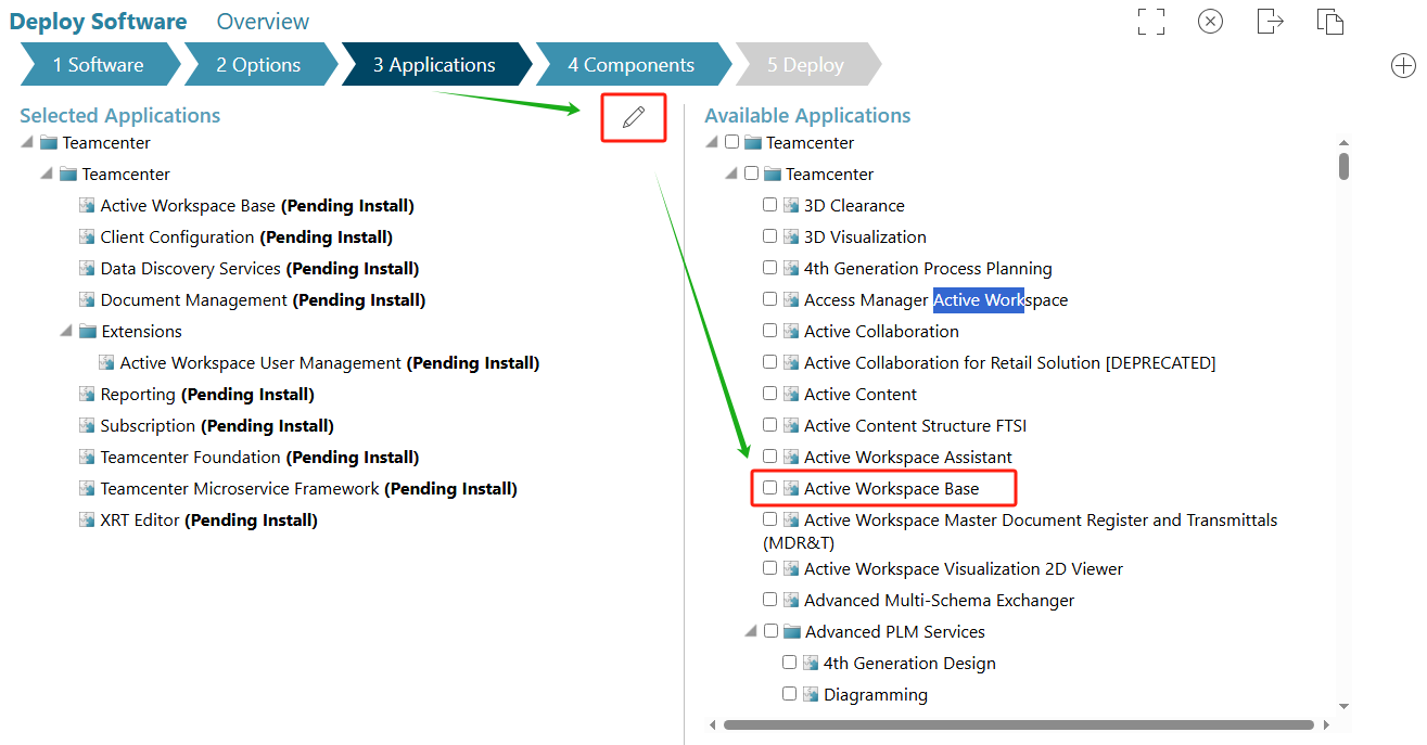 3. 在Applications分页面删除冗余的服务端组件,点击铅笔按钮开始修改,去除"Active Workspace Base"和"Teamcenter Microservice Framework",点击"Update Selected Applications"按钮保存。