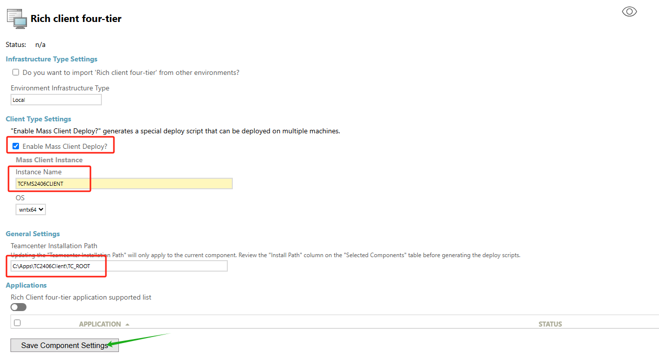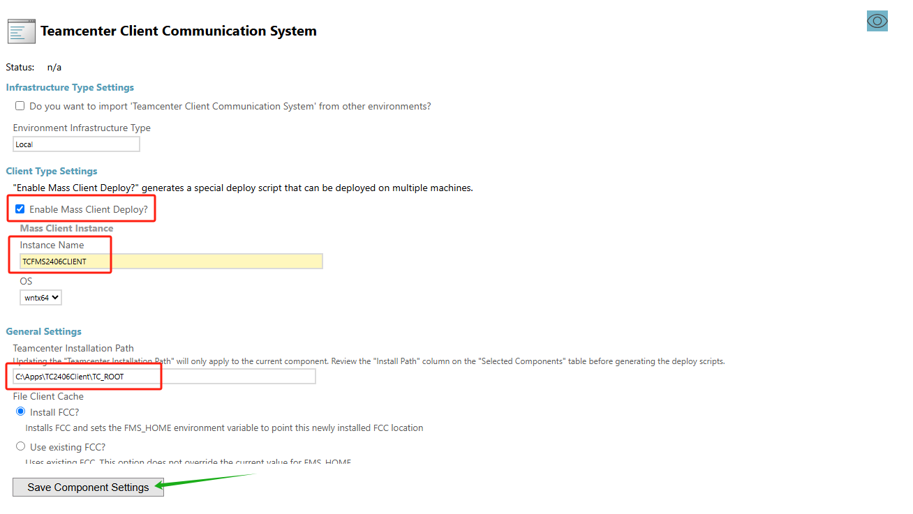 10. Teamcenter Client Communication System, 激活 "Enable Mass Client Deploy",并修改实例名称,我用了TCFMS2406Client,另外检查安装路径