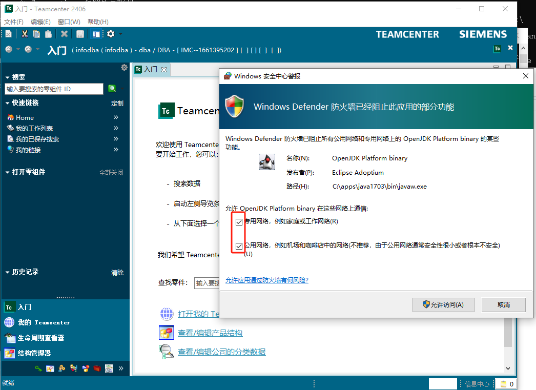 1. 从桌面快捷方式启动TC客户端,登录的用户名:infodba 密码:xmz2406X。请允许客户端通过防火墙,专用网络和公用网络都允许。