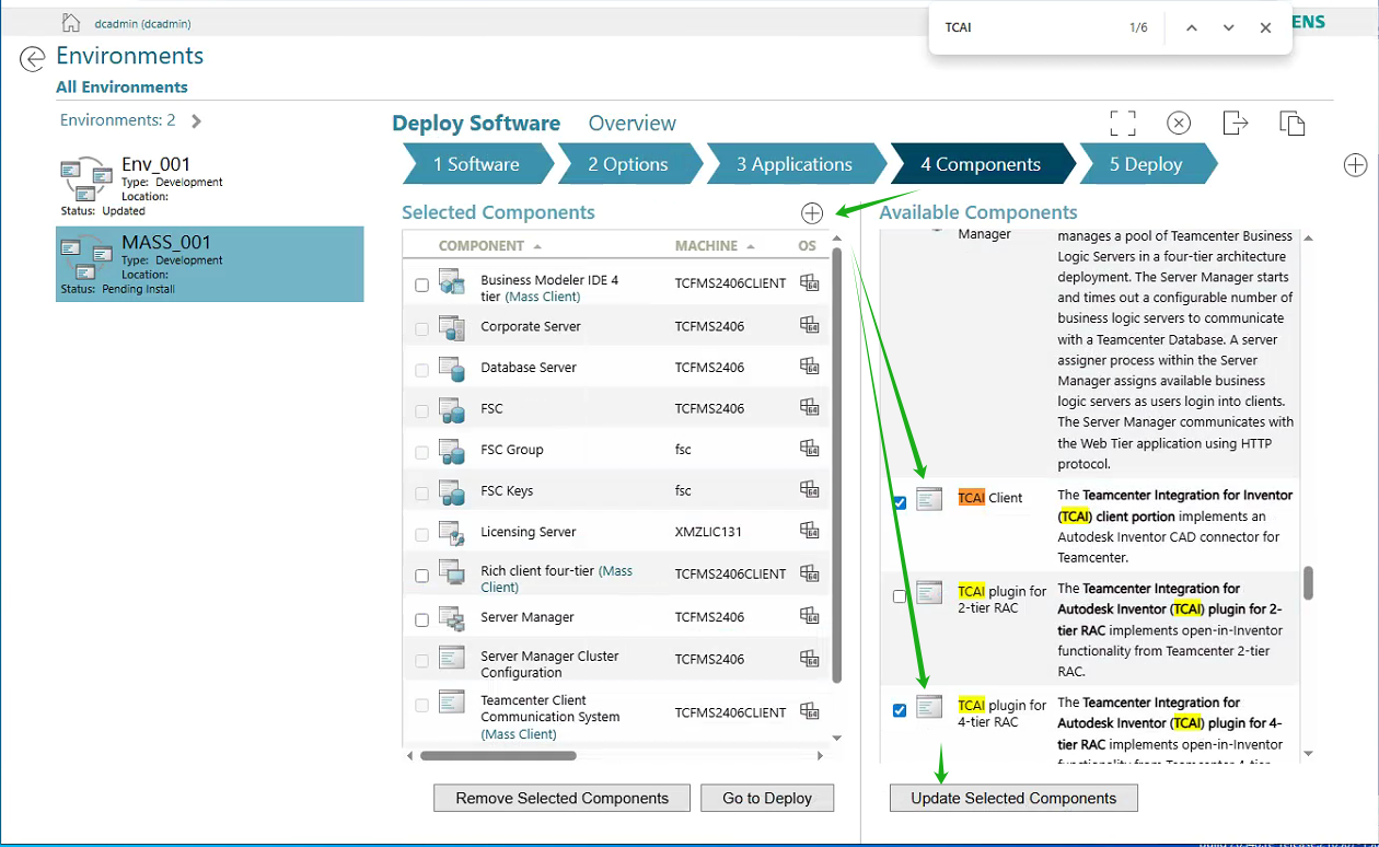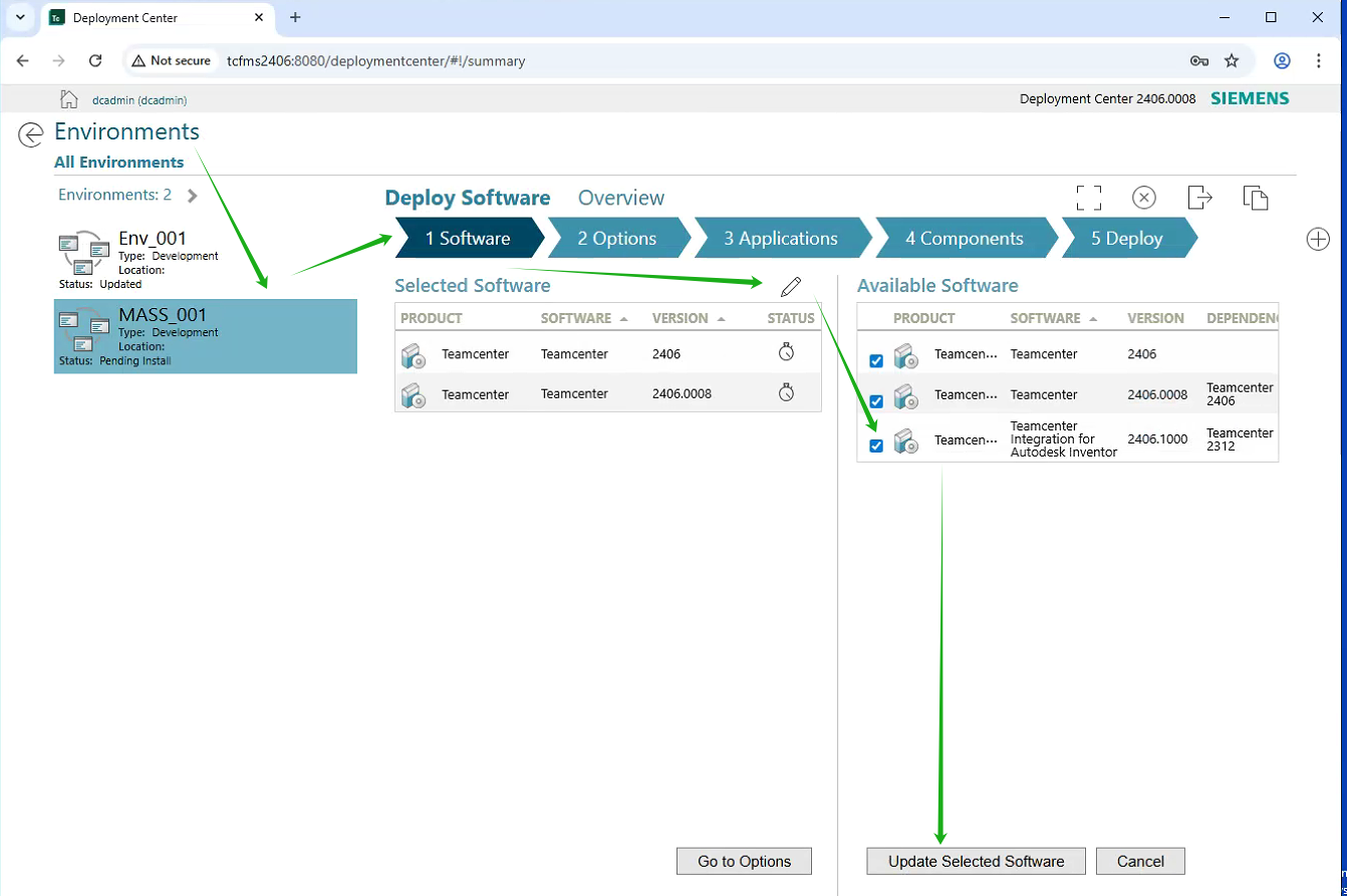 1. 在服务器上登录DC管理的网页,点击Environments,选中"MASS_001"环境,点击“Software”分页,点击铅笔按钮,增加TCAI 2406.1000的软件。