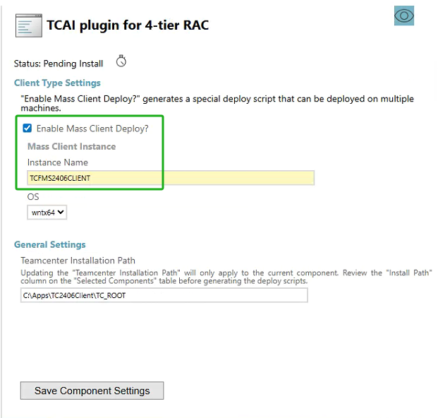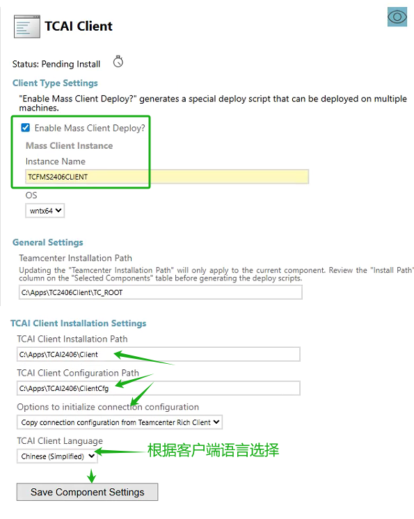 5. 开始填参,首先选择“TCAI Client”组件,勾选“Enable Mass Client Deploy”选项,“Instance Name”选填“TCFMS2406CLIENT”。其他安装设定也需要填参,保存。