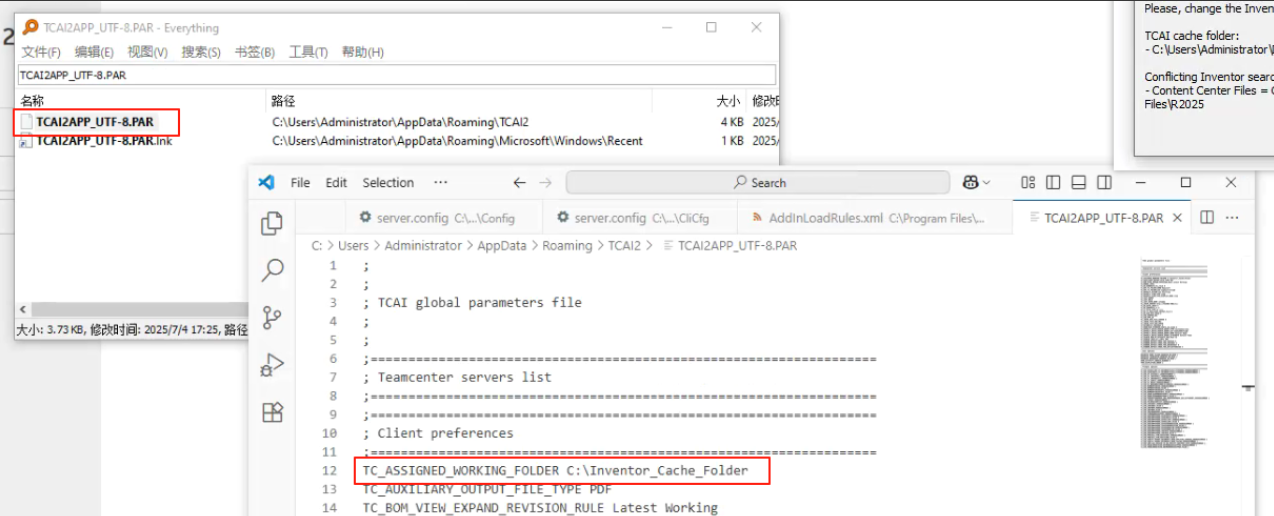 2、完成以上步骤,Inventor启动时还遇到个目录冲突的问题,说是TCAI的缓存目录和Inventor的搜索目录冲突。这个需要修改TCAI2APP_UTF-8.PAR文件,这个文件在正常启动后才会出现。
