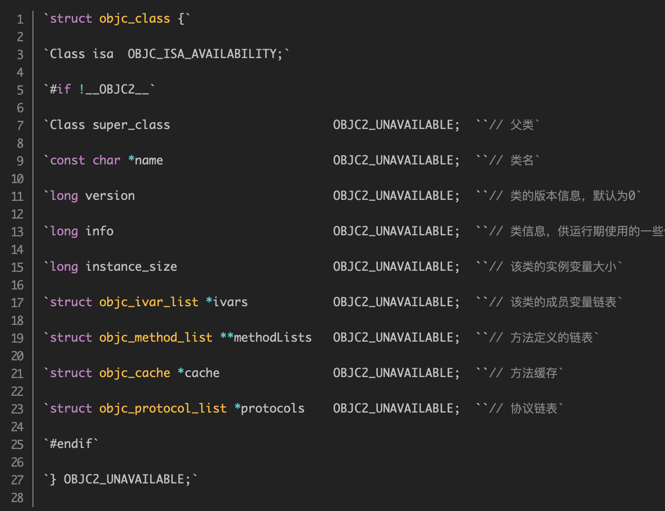 Objective-C类是由Class类型来表示的,它实际上是一个指向objc_class结构体的指针。它的定义如下: