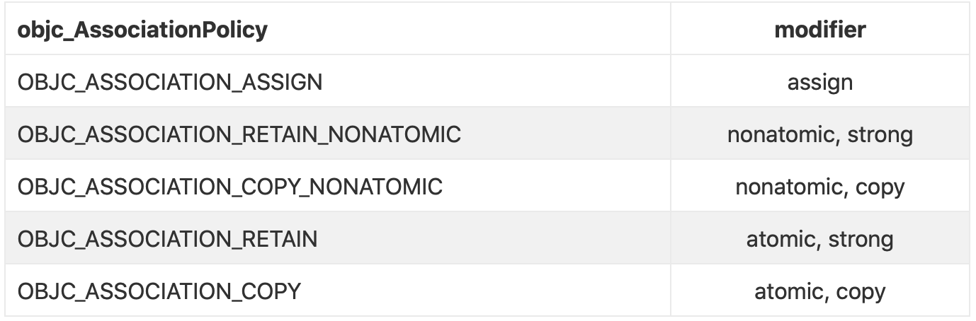 @selector(categoryProperty) 也就是参数中的 key,其实可以使用静态指针 static void * 类型的参数来代替,不过在这里,笔者强烈推荐使用 @selector(categoryProperty) 作为 key 传入。因为这种方法省略了声明参数的代码,并且能很好地保证 key 的唯一性objc_AssociationPolicy 对应了不通的属性修饰符:
