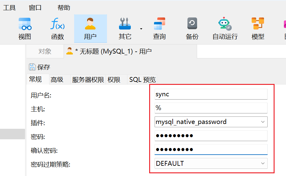 新账户的用户名为sync,密码是abc123456,密码加密策略一定要设置成mysql_native_password。