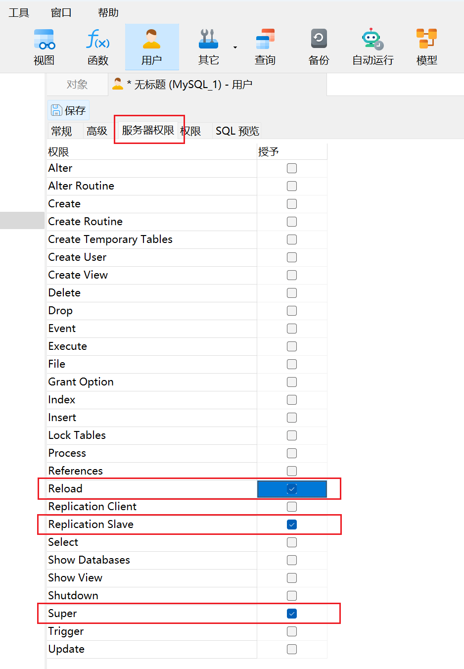 我们切换到服务器权限选项卡,然后勾选下面的三个权限,这三个权限都是订阅日志所必须的。