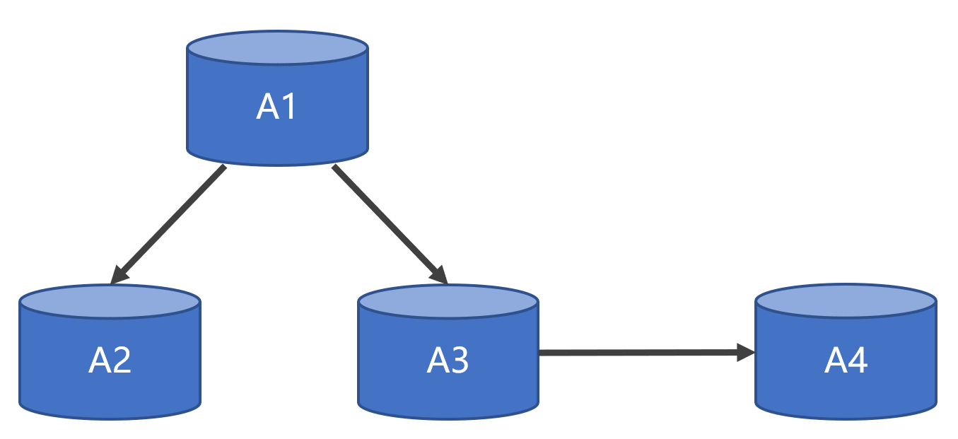 作为从节点来说,为什么要开启binlog日志呢?这是为了将来挂载更多读节点而准备的。现在我们是两个从节点与主节点同步数据,主节点的压力并不大。如果将来挂载更多的从节点,那么主节点的磁盘和网络压力就很大了,所以我们要分担主节点的压力。让从节点跟从节点去同步数据。例如下面的示意图,A3要把数据同步给A4,A3节点必须要开启binlog日志才可以。