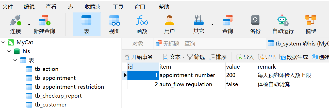 我们在MyCat的his逻辑库中随便打开一个数据表,里面的数据展示和操作与普通的MySQL数据表完全是一致的。但是Java程序要用SQL语句和MyCat打交道,所以我们来看看MyCat转发SQL语句的效果吧。