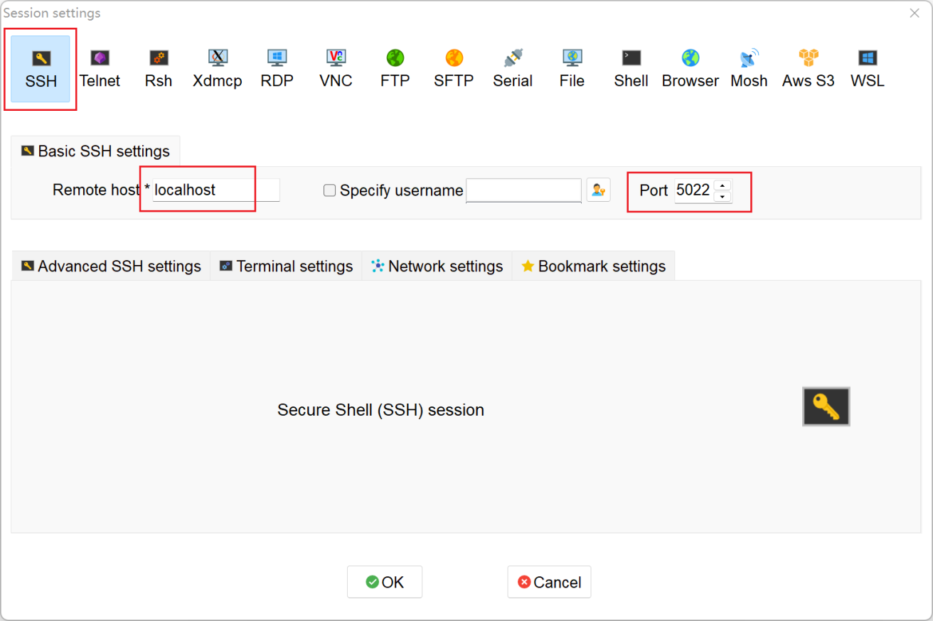 新建远程连接的时候,我们选择SSH方式,然后填写上连接信息。因为虚拟主机的网卡是NAT模式,所以我们填写localhost和5022端口,就能连接上Linux系统了。