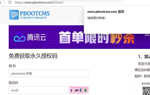 通过PbootCMS搭建的网站域名都需要免费获取授权码才可以打开,如果域名中含有中文,那就会提示"域名格式有误",这是为什么呢?如下图: