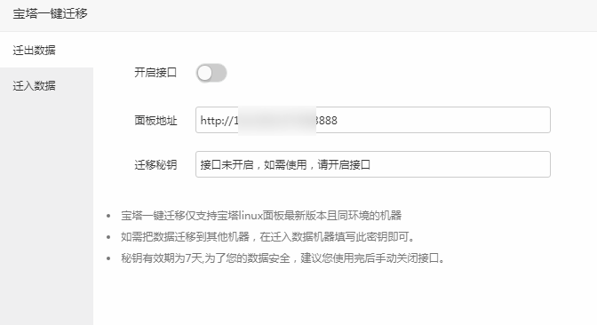 如需使用宝塔迁出数据,需要开启当前接口,不使用迁出数据时,请手动关闭该接口。