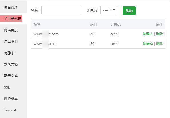 添加子目录的绑定,可以将域名绑定在该WEB站点下的子目录上。可支持单独为该子目录设置伪静态。