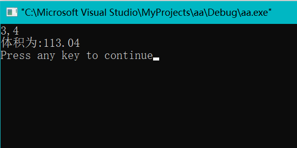 #include<stdio.h> #define PI 3.14 main() { float r,h,v; scanf("%f,%f",&r,&h); v=PI*r*r*h; printf("体积为:%.2f\n",v); }![]()