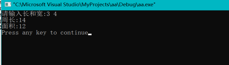 #include<stdio.h> main() { int a,b,c,s; printf("请输入长和宽:"); scanf("%d %d",&a,&b); c=(a+b)*2; s=a*b; printf("周长:%d\n面积:%d\n",c,s); }![]()