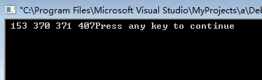 #include<stdio.h> main() { int ge,shi,bai,i=100; while(i<1000) { ge=i%10; shi=i%100/10; bai=i/100; if(i==ge*ge*ge+shi*shi*shi+bai*bai*bai) printf("%4d",i); i++; } }