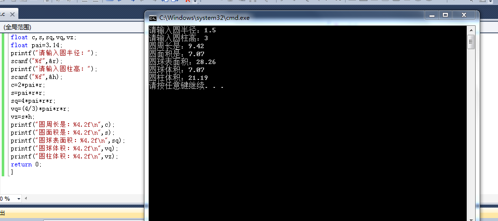float c,s,sq,vq,vz; float pai=3.14; printf("请输入圆半径:"); scanf("%f",&r); printf("请输入圆柱高:"); scanf("%f",&h); c=2*pai*r; s=pai*r*r; sq=4*pai*r*r; vq=(4/3)*pai*r*r; vz=s*h; printf("圆周长是:%4.2f\n",c); printf("圆面积是:%4.2f\n",s); printf("圆球表面积:%4.2f\n",sq); printf("圆球体积:%4.2f\n",vq); printf("圆柱体积:%4.2f\n",vz); return 0; }