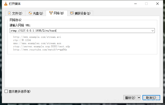 ffmpeg -re -rtsp_transport tcp -i "rtsp地址" -f flv -vcodec libx264 -vprofile baseline -acodec aac -ar 44100 -strict -2 -ac 1 -f flv -s 1280x720 -q 10 "rtmp://127.0.0.1:1935(nginx.conf的rtmp监听端口)/live(rtmp模块下application设置)/test(命名)"