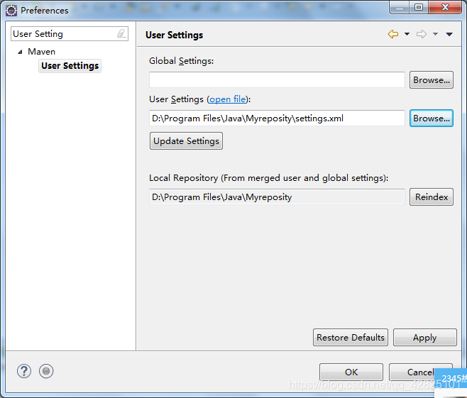 Preferences--->maven--->User Setting--->Browse(选中的按钮 选择自己创建文件夹下的setting.xml)