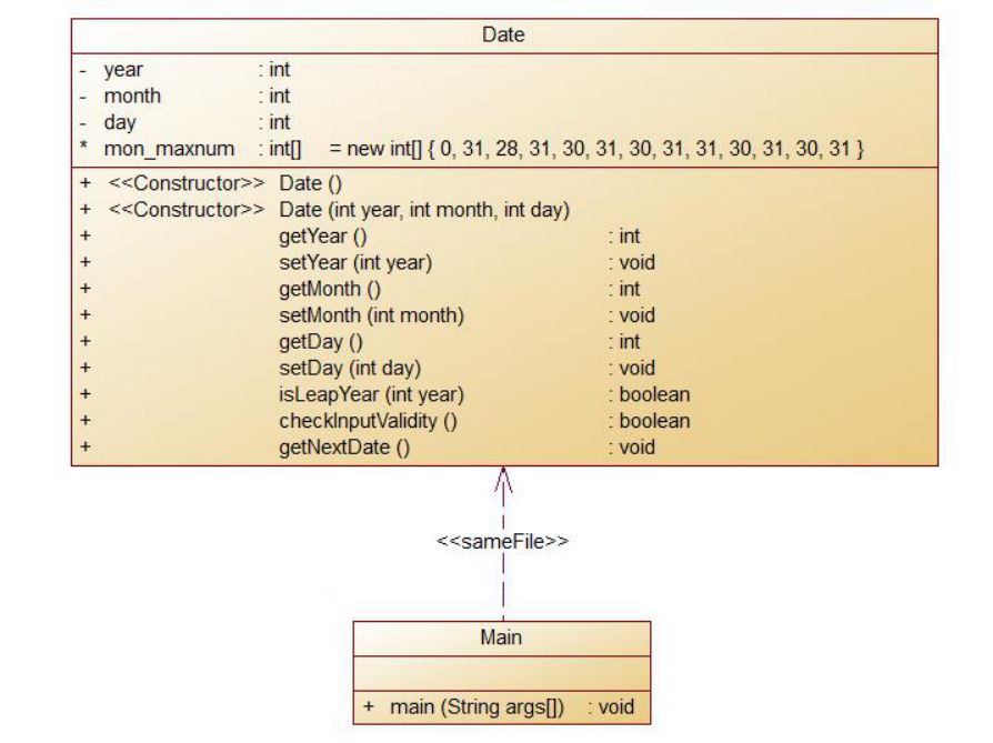首先我的思路方向是主方法用于输入参数,isLeapYear用于判断输入的日期年份是否为闰年并给与其他的方法调用处理参数,checkInputValidity用于判断日期输入的合法性, nextDate用于输出日期的下一天。