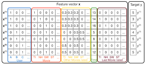 - 然而上述方程会因为数据稀疏导致问题,例如我们有 \(x_{张三}\) 代表观众张三, \(x_{星球大战}\) 代表电影《星球大战》,可惜电影实在太多,张三看电影也不多,所以张三没看过《星球大战》。那么方程中的 \(w_{张三,星球大战}\) 就没有样本可以训练。概括来说,对于样本中未出现过交互的特征向量,这种建模方式不能对相应的参数进行估计。