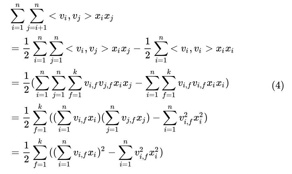 - FM算法直接进行计算的时间复杂度是 \(O(kn^{2})\) ,因为所有的交叉特征都需要计算。但是通过公式变换,可以减少到线性复杂度(时间复杂度 \(O(kn)\) ),方法如下: