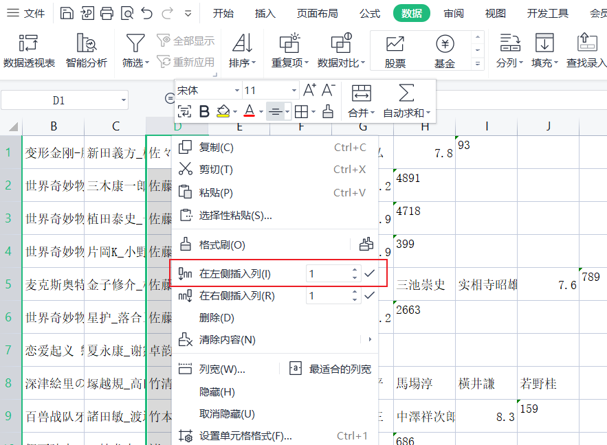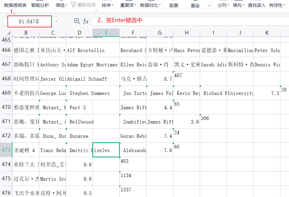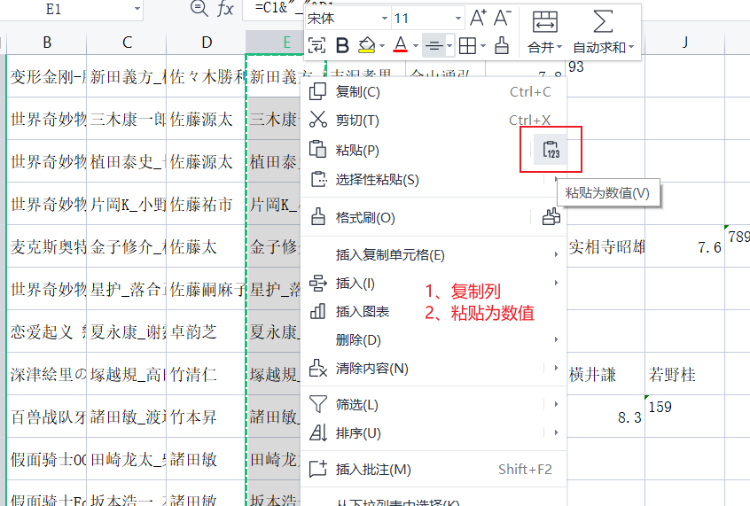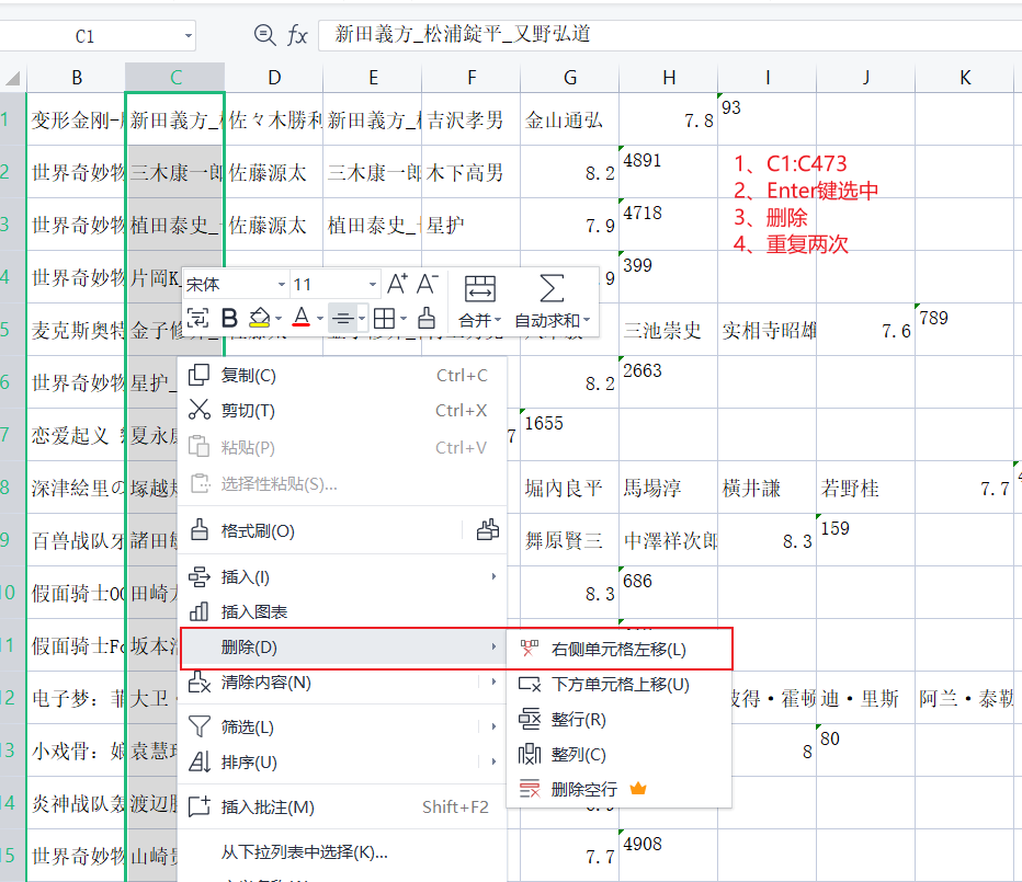 比如,表格中“导演”占了很多列,每行中的导演数目又不相同,想合并导演列。
