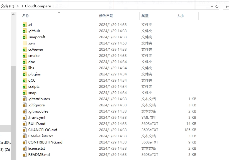 1、下载CloudCompare源代码,解压(本人是放于 F:\1_CloudCompare);