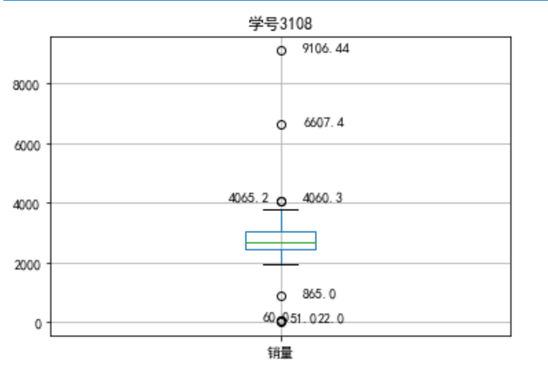 import pandas as pd catering_sale="D:\数据分析\catering_sale.xls" data=pd.read_excel(catering_sale,index_col=u'日期') print(data.describe()) import matplotlib.pyplot as plt plt.rcParams['font.sans-serif']=['SimHei'] plt.rcParams['axes.unicode_minus']=False plt.figure() p=data.boxplot(return_type='dict') x=p['fliers'][0].get_xdata() y=p['fliers'][0].get_ydata() y.sort() for i in range(len(x)): if i>0: plt.annotate(y[i],xy=(x[i],y[i]),xytext=(x[i]+0.05 -0.8/(y[i]-y[i-1]),y[i])) else: plt.annotate(y[i],xy=(x[i],y[i]),xytext=(x[i]+0.08,y[i])) plt.title('学号3108') plt.show()
