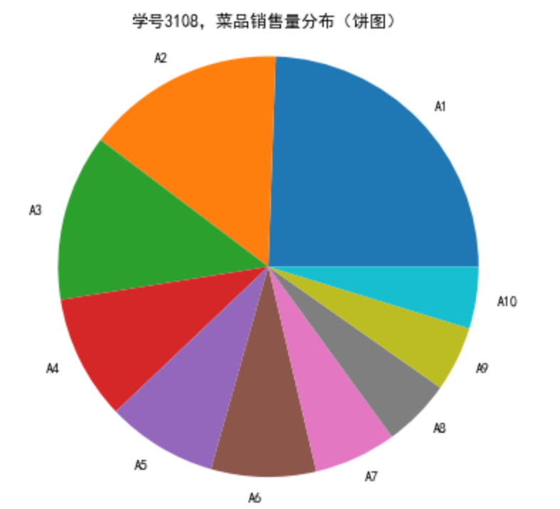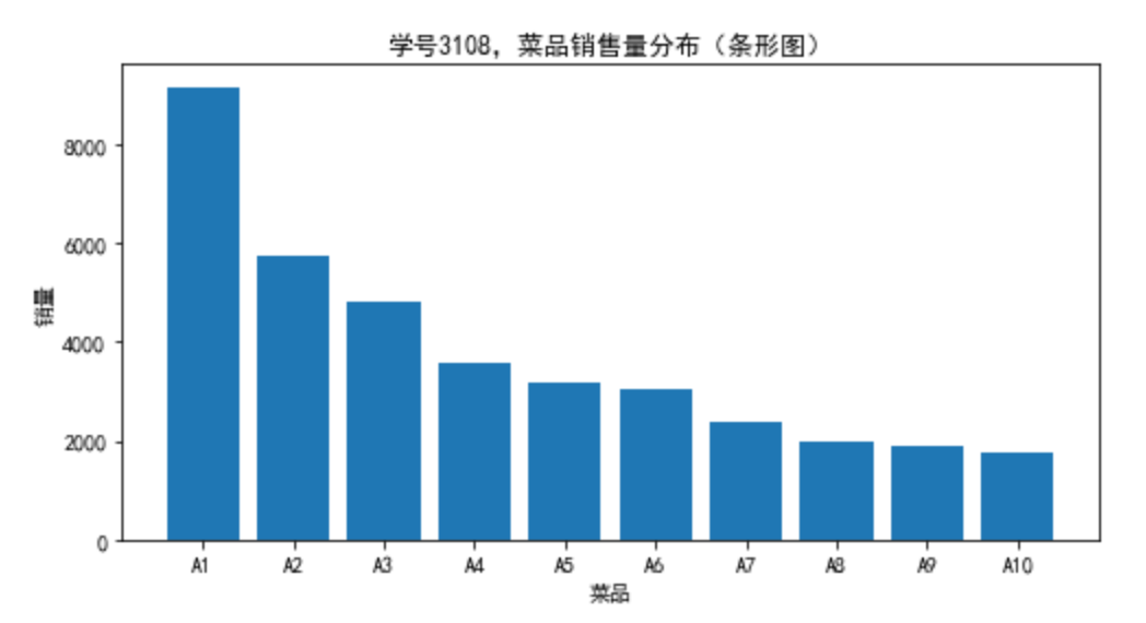 import pandas as pd import matplotlib.pyplot as plt catering_dish_profit="D:\数据分析\catering_dish_profit.xls" data=pd.read_excel(catering_dish_profit) x=data['盈利'] labels=data['菜品名'] plt.figure(figsize=(8,6)) plt.pie(x,labels=labels) plt.rcParams['font.sans-serif']='SimHei' plt.title('学号3108,菜品销售量分布(饼图)') plt.axis('equal') plt.show() x=data['菜品名'] y=data['盈利'] plt.figure(figsize=(8,4)) plt.bar(x,y) plt.rcParams['font.sans-serif']='SimHei' plt.xlabel('菜品') plt.ylabel('销量') plt.title('学号3108,菜品销售量分布(条形图)') plt.show()