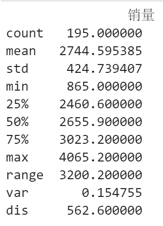 import pandas as pd catering_sale="D:\数据分析\catering_sale.xls" data=pd.read_excel(catering_sale,index_col='日期') data=data[(data['销量']>400)&(data['销量']<5000)] statistics=data.describe() statistics.loc['range']=statistics.loc['max']-statistics.loc['min'] statistics.loc['var']=statistics.loc['std']/statistics.loc['mean'] statistics.loc['dis']=statistics.loc['75%']-statistics.loc['25%'] print(statistics)