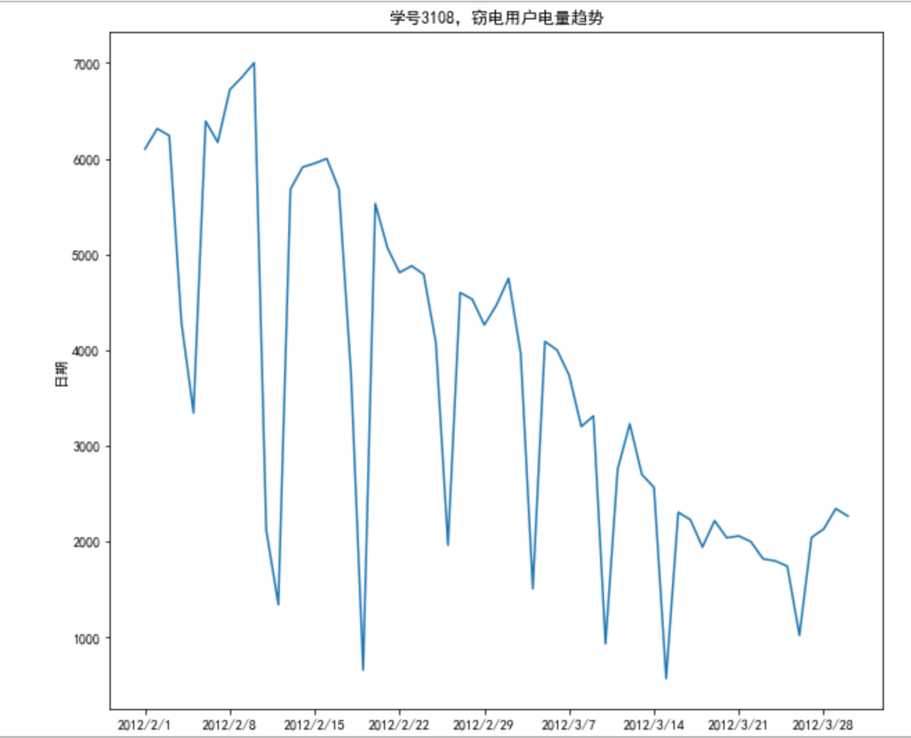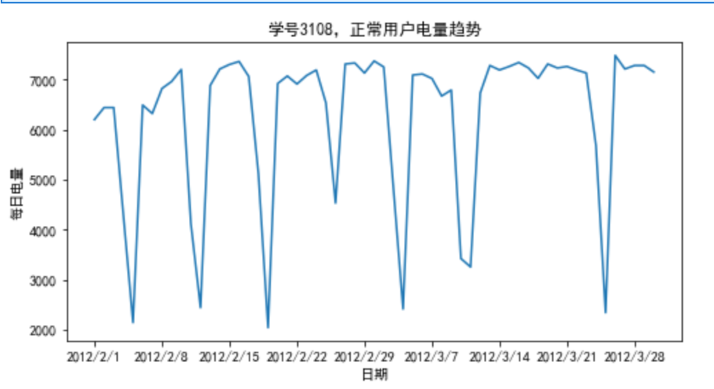 import pandas as pd import matplotlib.pyplot as plt df_normal=pd.read_csv("D:/数据分析/user.csv") plt.figure(figsize=(8,4)) plt.plot(df_normal["Date"],df_normal["Eletricity"]) plt.xlabel("日期") x_major_locator=plt.MultipleLocator(7) ax=plt.gca() ax.xaxis.set_major_locator(x_major_locator) plt.ylabel("每日电量") plt.title("学号3108,正常用户电量趋势") plt.rcParams['font.sans-serif']=['SimHei'] plt.show() df_steal=pd.read_csv("D:\数据分析\Steal user.csv") plt.figure(figsize=(10,9)) plt.plot(df_steal["Date"],df_steal["Eletricity"]) plt.xlabel("日期") plt.ylabel("日期") x_major_locator=plt.MultipleLocator(7) ax=plt.gca() ax.xaxis.set_major_locator(x_major_locator) plt.title("学号3108,窃电用户电量趋势") plt.rcParams['font.sans-serif']=['SimHei'] plt.show()