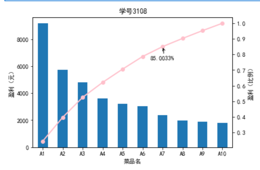 import pandas as pd dish_profit="D:\数据分析\catering_dish_profit.xls" data=pd.read_excel(dish_profit,index_col='菜品名') data=data['盈利'].copy() data.sort_values(ascending=False) import matplotlib.pyplot as plt plt.rcParams['font.sans-serif']=['SimHei'] plt.rcParams['axes.unicode_minus']=False plt.figure() data.plot(kind='bar') plt.ylabel('盈利(元)') p=1.0*data.cumsum()/data.sum() p.plot(color='pink',secondary_y=True,style='-o',linewidth=2) plt.annotate(format(p[6],'.4%'),xy=(6,p[6]),xytext=(6*0.9,p[6]*0.9), arrowprops=dict(arrowstyle="->",connectionstyle="arc3,rad=.2")) plt.ylabel('盈利(比例)') plt.title('学号3108') plt.show()