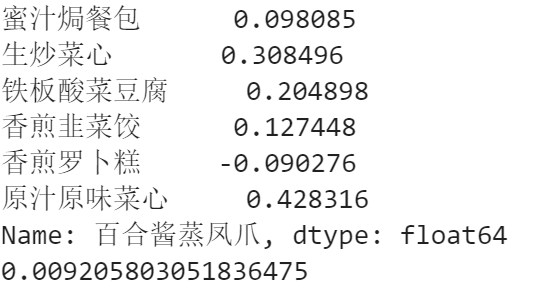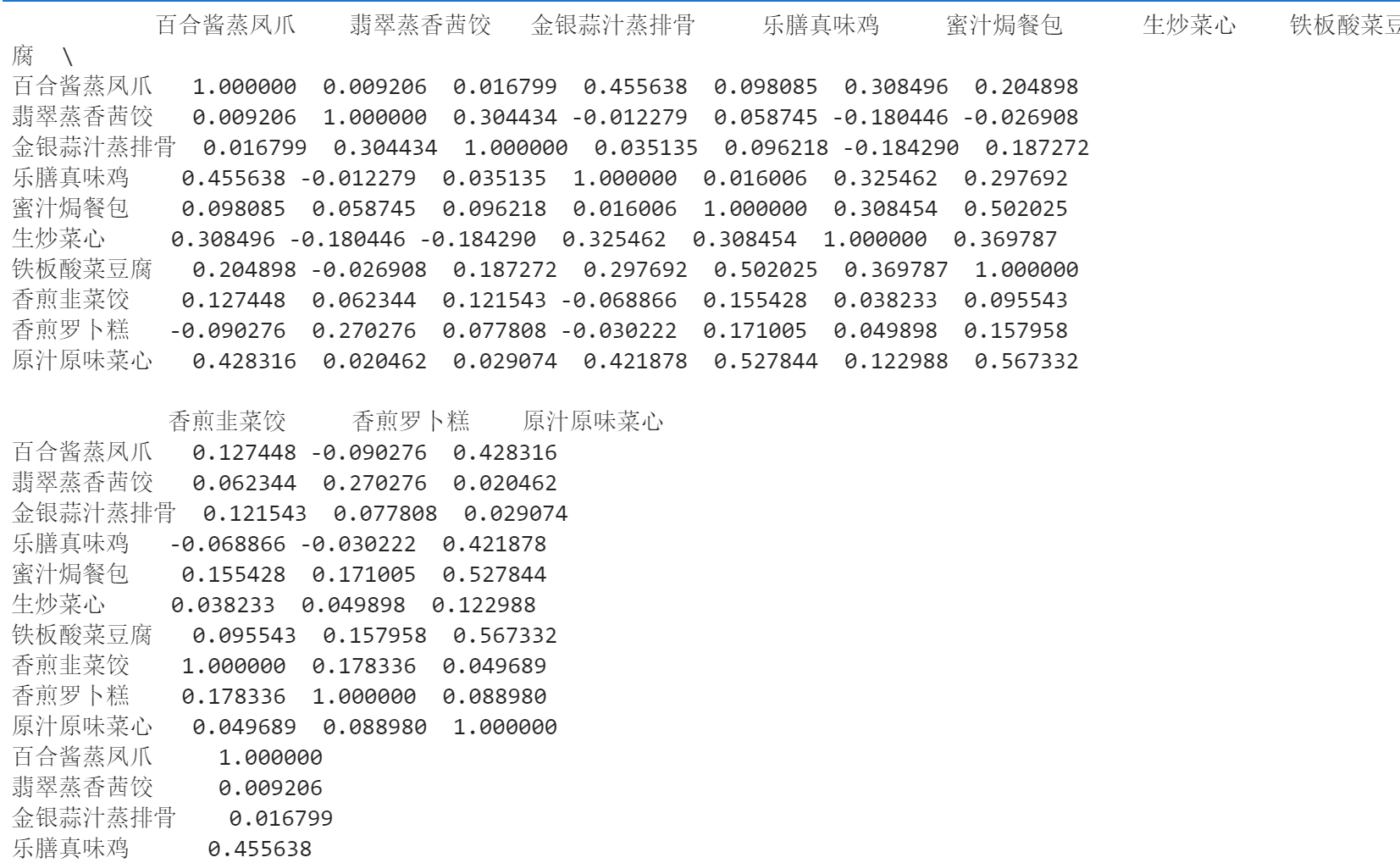 #餐饮销量数据相关性分析 import pandas as pd catering_sale="D:\数据分析\catering_sale_all.xls" data=pd.read_excel(catering_sale,index_col='日期') print(data.corr()) print(data.corr()['百合酱蒸凤爪']) print(data['百合酱蒸凤爪'].corr(data['翡翠蒸香茜饺']))