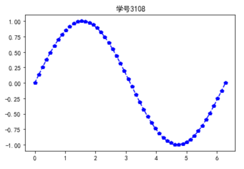 import matplotlib.pyplot as plt import numpy as np x=np.linspace(0,2*np.pi,50) y=np.sin(x) plt.plot(x,y,'bp--') plt.title('学号3108') plt.show()