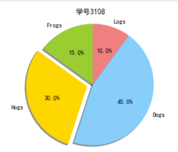 import matplotlib.pyplot as plt labels='Frogs','Hogs','Dogs','Logs' sizes=[15,30,45,10] colors=['yellowgreen','gold','lightskyblue','lightcoral'] explode=(0,0.1,0,0) plt.pie(sizes,explode=explode,labels=labels,colors=colors,autopct='%1.1f%%', shadow=True,startangle=90) plt.axis('equal') plt.title('学号3108') plt.show()