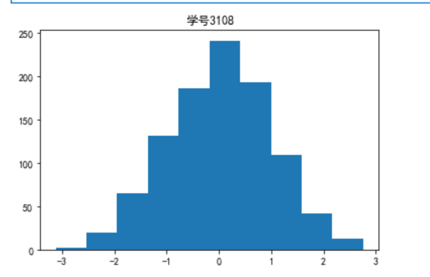 import matplotlib.pyplot as plt import numpy as np x=np.random.randn(1000) plt.hist(x,10) plt.title('学号3108') plt.show()