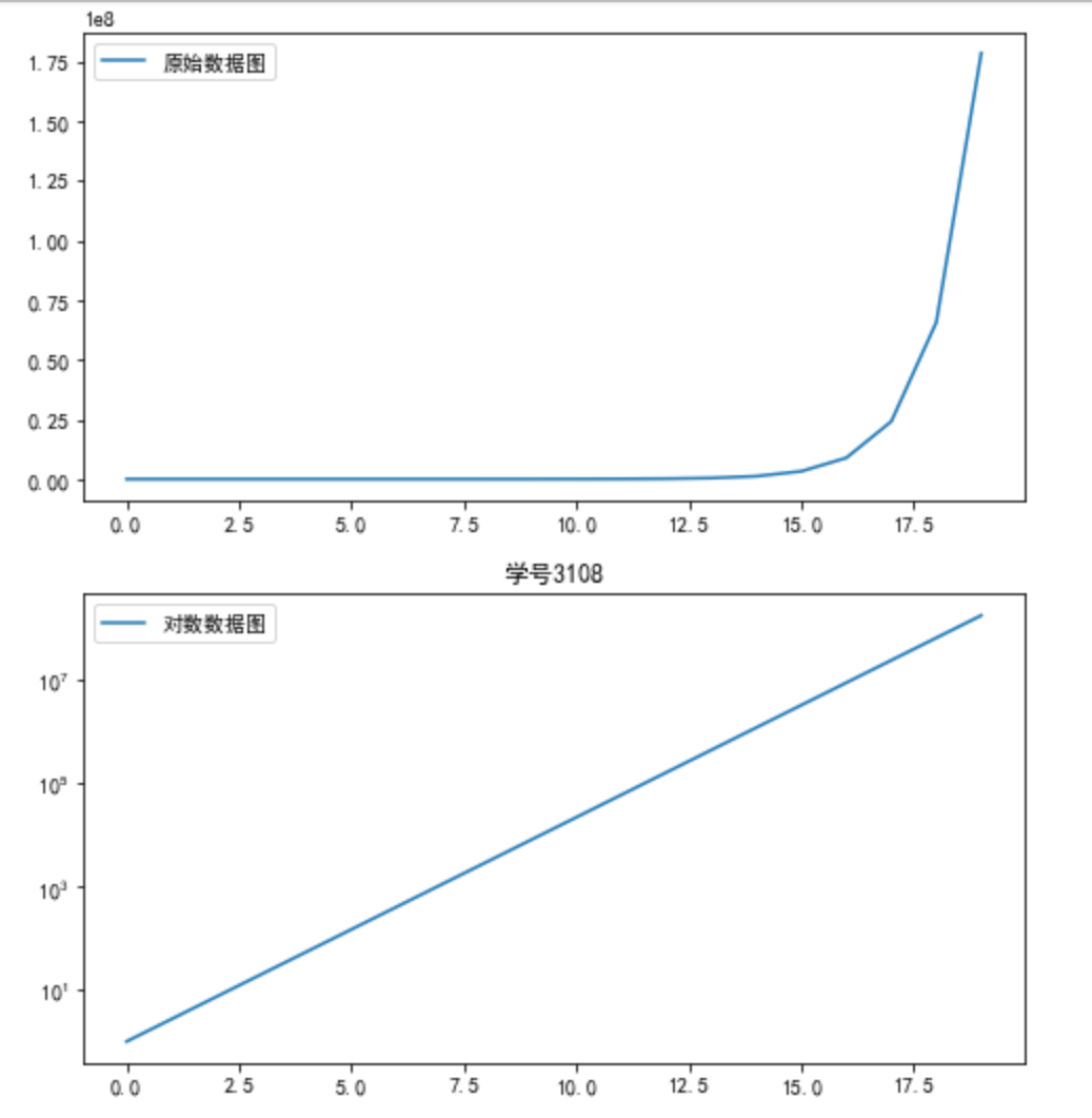 import matplotlib.pyplot as plt plt.rcParams['font.sans-serif']=['SimHei'] plt.rcParams['axes.unicode_minus']=False import numpy as np import pandas as pd x=pd.Series(np.exp(np.arange(20))) plt.figure(figsize=(8,9)) ax1=plt.subplot(2,1,1) x.plot(label='原始数据图',legend=True) ax1=plt.subplot(2,1,2) x.plot(logy=True,label='对数数据图',legend=True) plt.title('学号3108') plt.show()
