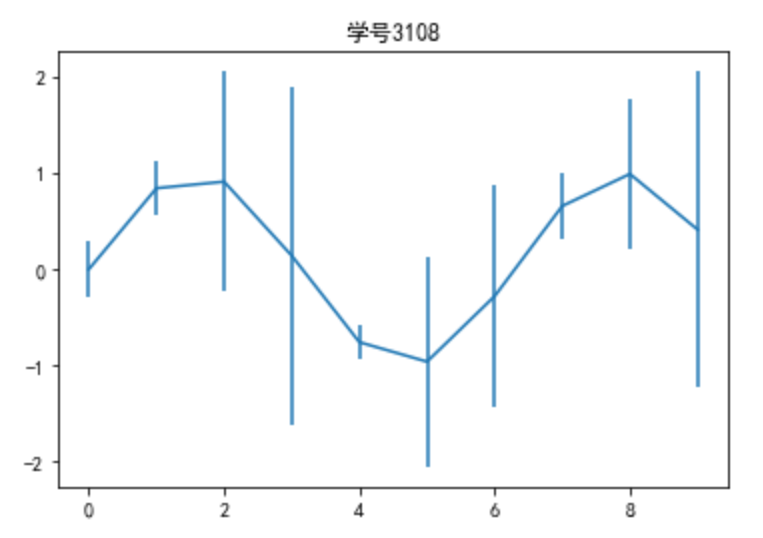 import matplotlib.pyplot as plt plt.rcParams['font.sans-serif']=['SimHei'] plt.rcParams['axes.unicode_minus']=False import numpy as np import pandas as pd error=np.random.randn(10) y=pd.Series(np.sin(np.arange(10))) y.plot(yerr=error) plt.title('学号3108') plt.show()