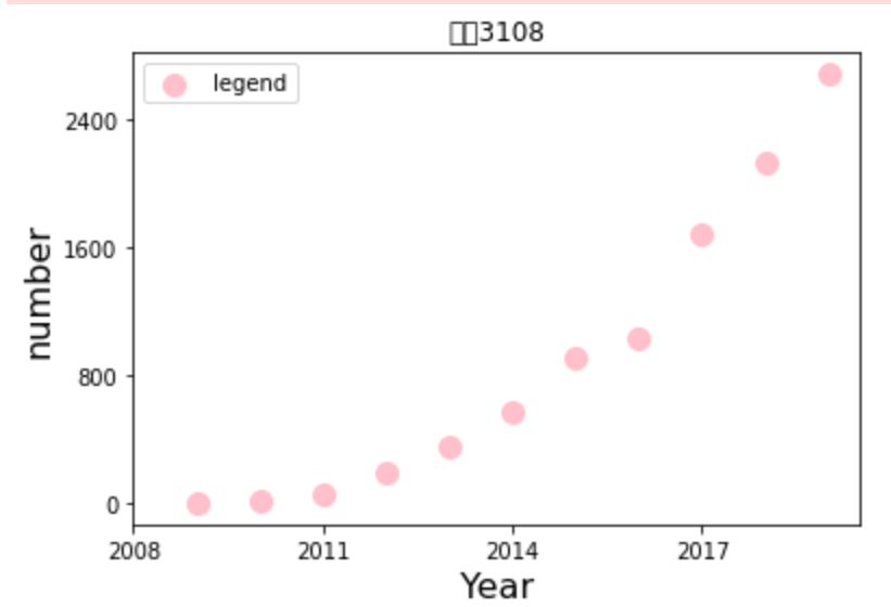 import matplotlib.pyplot as plt years = [2009, 2010, 2011, 2012, 2013, 2014, 2015, 2016, 2017, 2018, 2019] turnovers = [0.5, 9.36, 52, 191, 350, 571, 912, 1027, 1682, 2135, 2684] plt.figure() plt.scatter(years, turnovers, c='pink', s=100, label='legend') plt.xticks(range(2008, 2020, 3)) plt.yticks(range(0, 3200, 800)) plt.xlabel("Year", fontdict={'size': 16}) plt.ylabel("number", fontdict={'size': 16}) plt.title("Title", fontdict={'size': 20}) plt.legend(loc='best') plt.title('学号3108') plt.show()