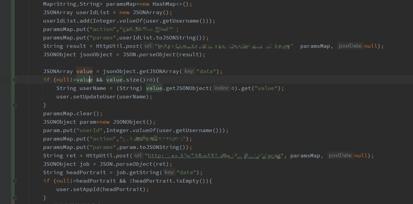然后发送请求调用三方接口,获取返回:String result = HttpUtil.post("http://XXXXX", paramsMap, null);