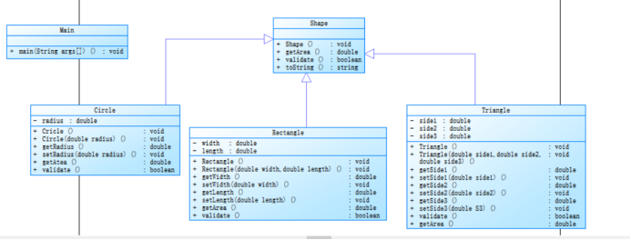三个图形Circle、Rectangle、Triangle继承Shape类,继承其求面积、判断图形是否合法、toString及属性,代码简洁,提高复用性,实现多态