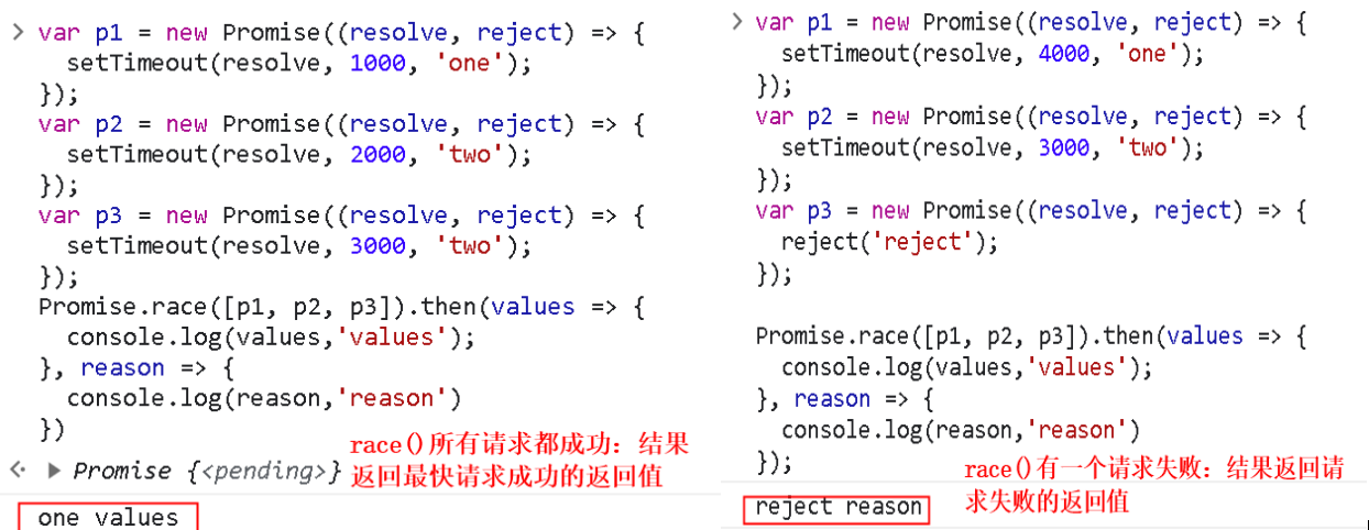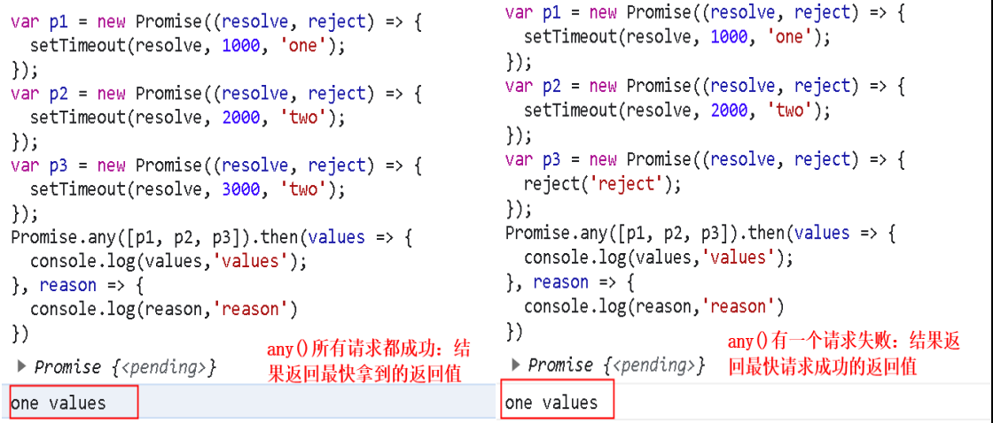 只要参数实例有一个变成fulfilled状态,包装实例就会变成fulfilled状态;如果所有参数实例都变成rejected状态,包装实例就会变成rejected状态。