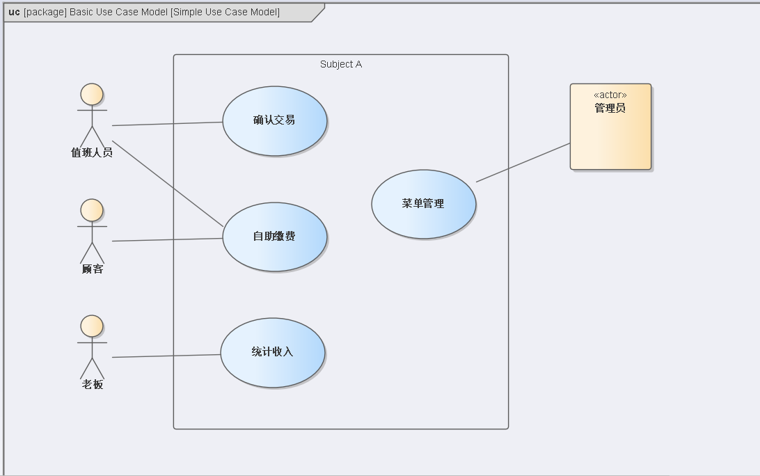 基本用例模型模式创建元素和用例图,描述用户角色希望从系统中实现的目标。用例都包含在系统边界内,参与者都在边界之外。