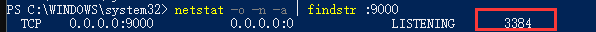 使用 netstat -o -n -a | findstr :9000 命令,查看占用端口号的程序 PS: 我node服务器启动端口号为9000