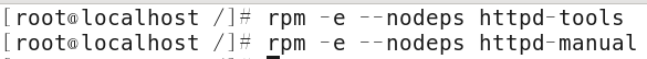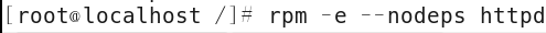 使用rpm -e --nodeps httpd 命令卸载,--nodeps是指卸载软件时,忽略依赖关系。卸载时不一定要写软件包的全称,只要写软件包名就可以了,如只要写httpd或httpd-tools