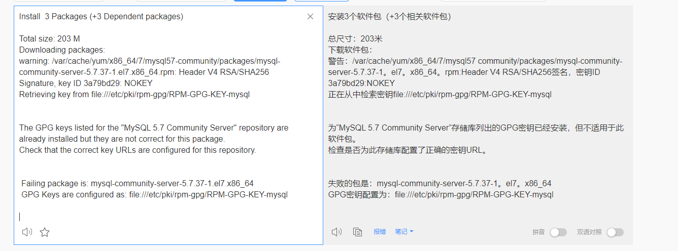 失败的包是:mysql-community-server-5.7.37-1。el7。x86_64 GPG密钥配置为:file:///etc/pki/rpm-gpg/RPM-GPG-KEY-mysqlkei