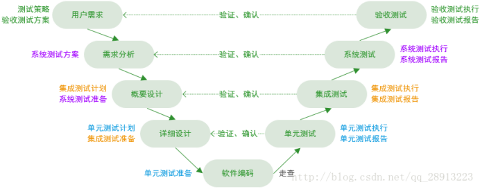 V 模型的左边下降的是开发过程各阶段,与此相对应的是右边上升的部分,即各测试过程的各个阶段。